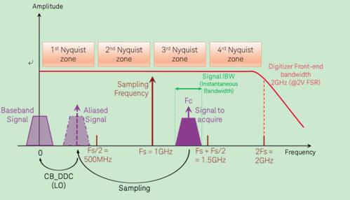 - 输入带宽和采样率。选择具有足够带宽的数字化仪或示波器对于准确捕获信号中最高频率分量非常重要。奈奎斯特采样定理表明,对于采样系统,奈奎斯特频率Fn等于采样频率 fs 的 1/2。奈奎斯特频率以上的信号能量将与 ADC 采样率混合,其产物将折返到基带上感兴趣信号的顶部,导致无法实施精确采集(也称为混叠)。输入带宽限制滤波器通常用于确保没有信号能量高于有效奈奎斯特频率。