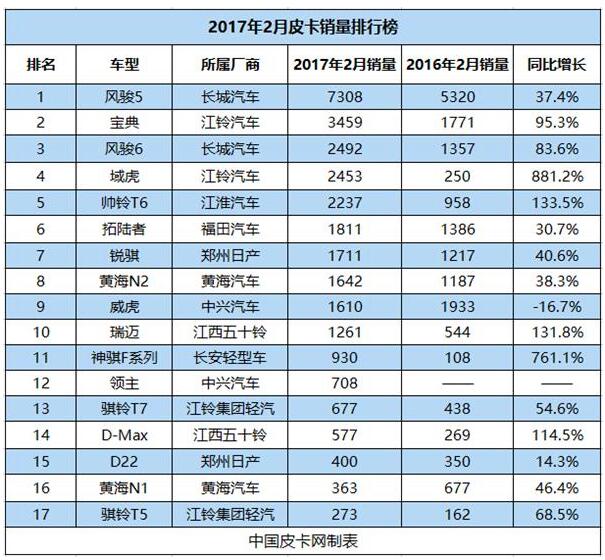 2月,江淮皮卡共售出2237台,位于国内主流皮卡企业销量排名第四位,销量同比增长133.5%,增幅位列国内皮卡企业2月销量增幅榜第三。如果统计1月和2月的销量之和,那么江淮皮卡销量达到了4254台,超越了福田、郑州日产和黄海,位居行业第四,仅次于长城、江铃和中兴。