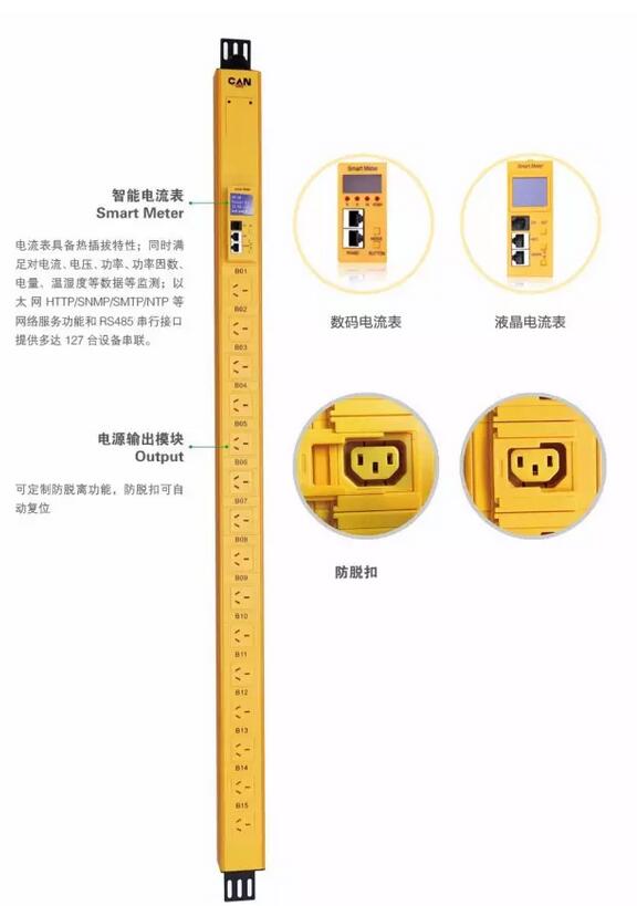 ▲昌遂远程智能PDU多彩系列(1U,IP+RS485),广泛应用于IDC、银行、证券、政府、企业等数据中心机房。电流表具有热插拔特性;同时满足对电流、电压、功率、功率因数、电量、温湿度等数据的监测;以太网HTTP/SNMP/SMTP/NTP等网络服务功能和RS485串行接口提供多达127台设备串接。