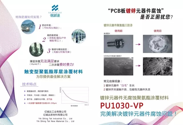 该产品无有机溶剂VOC释放、快速固化、安全环保、高效节能,主要应用于线路板防腐各领域。“UV暗固化三防漆”非阴影区通过紫外光照固化,进而引发阴影区发生暗反应,实现固化完全,具有低收缩率、高附着力、储存稳定、对潮气等不敏感、高绝缘强度、高防腐强度等突出性能。该产品通过RoHS/REACH等相关环保认证和UL安全认证,已广泛应用于电子PCBA防腐保护,并获好评。此外,亿铖达还推出了“触变型聚氨酯厚层涂覆材料”等多款引领行业潮流的创新型产品。