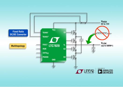 72V 固定比例 DC/DC 控制器无需功率电感器,在非隔离式中间总线转换器应用中提供超过 500W 功率