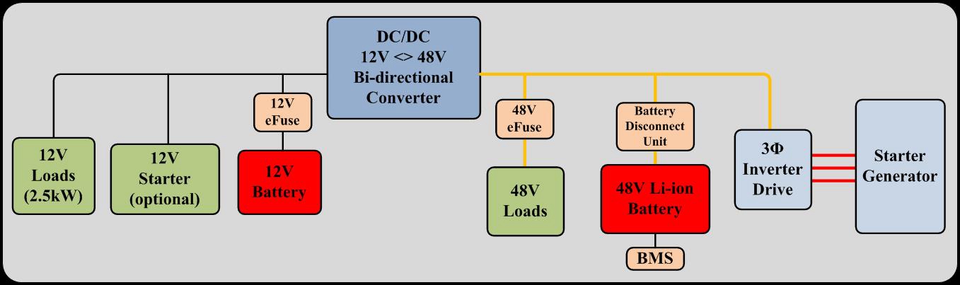 48V架构的选择宽泛,且在不断增加。最基本的系统包括一块电池、一个起动发电机、一个48V至12V转换器,且通常至少有一个48V负载。由于48V汽车仍然保留12V电池和多个12V负载,因此目前这些系统可能会以双电压系统的形式存在。