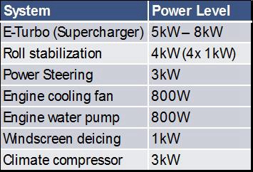 能想得到的48V负载有多种多样,而许多较高的功率负载无法通过12V系统实现。其中最高的是电控增压器。由于增压器需要在几分之一秒内加速到极高的速度,因此需要相当高的瞬态功率。典型的增压器驱动包括一个低惯性三相电动机,由一个三相逆变器驱动。尽管平均功率相对较低,但峰值功率可达8kW以上。如此宽泛的功率范围配置可完美匹配48V系统。许多其它汽车子系统也非常适合48V架构,无论是单相还是三相配置。图3中列出了可能的48V负载。