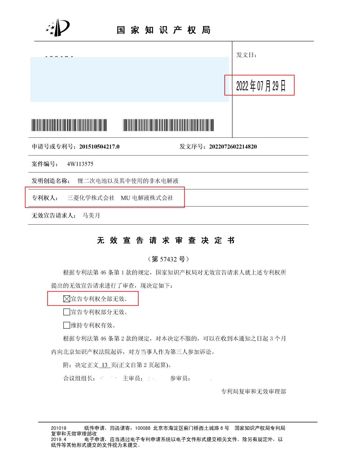 7月29日,国家知识产权局数据显示,三菱化学株式会社和MU电解液株式会社的一件名称为"锂二次电池以及其中使用的非水电解质”的中国发明专利ZL201510504217.0,被“宣告专利权全部无效”,无效请求人是一位自然人。