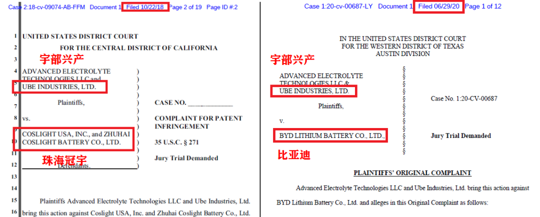 像与三菱化学一直合作的宇部兴产UBE近几年在美国的专利诉讼记录上,中国的比亚迪(2020年)和去年刚刚科创板上市的珠海冠宇(2018,Coslight光宇,珠海光宇2019年更名为珠海冠宇)都曾因专利侵权被UBE告上美国法庭。