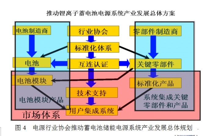 为了探索在市场环境下利于资源整合的模式,中国电子商会电源专业委员会与中华环保联合会新能源和节能与新能源汽车储能系统行业委员会、北京电源行业协会合作,制定了我国推动锂离子蓄电池储能电源系统行业发展的规划(如图4)。