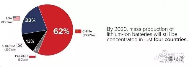 从上图可以看出,锂电池主要由4个国家生产:中国占了62%,产量108GWh;美国排第二位,占比22%,38GWh;韩国第三位,占比13%,产量23GWh;波兰第四位,占比3%,产量5GWh。