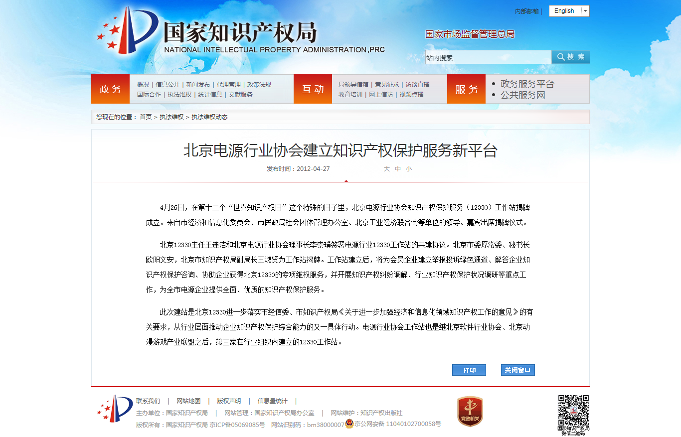 国家知识产权局报道:北京电源行业协会建立知识产权保护服务新平台