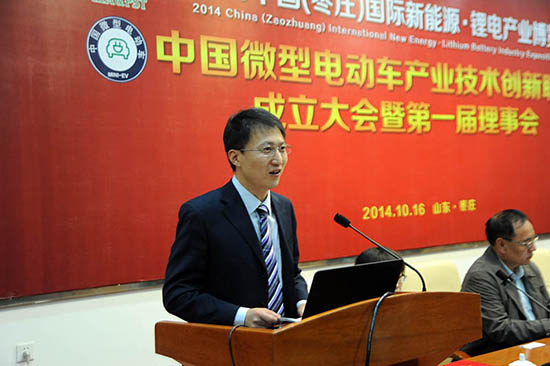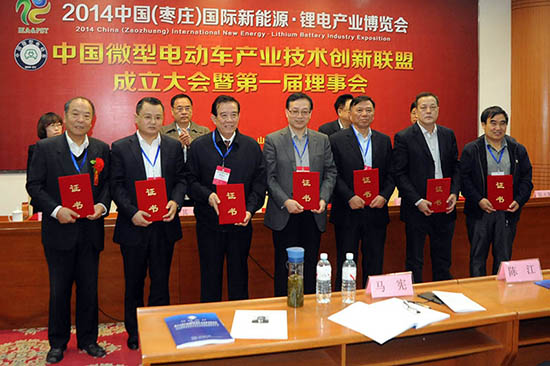 10月16日上午,中国微型电动车产业技术创新联盟成立大会暨第一届理事会在山东枣庄召开。中国科学院院士、中国化学会顾问、钱逸泰教授出席,枣庄市副市长王新宁致辞,北京大学其鲁教授、北京汽车行业协会副秘书长徐华、中国科学院电工技术研究所陈永翀教授在主席台就座。在会议上,中国电源工业协会理事长、工信部电子信息产品司助理巡视员季国平当选为联盟理事长,有关领导在会议上向到会的副理事长及秘书长、副秘书长颁发了证书。
