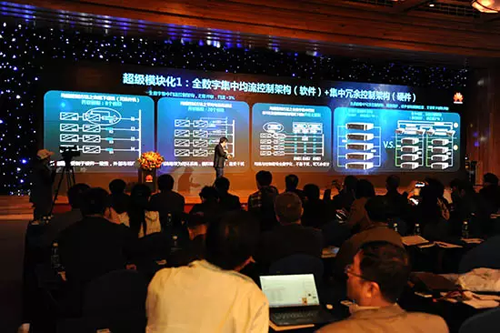 华为UPS产品领域总经理吕艺行在会议现场与实验室的技术人员通过远程视频一同演示了华为8台800kVA UPS并机实验,以及短路测试、模块热插拔、高温满载等可靠性验证,以及并机系统环流、负载适应性、电网适应性等性能测试。