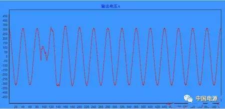 将具有IGBT短路检测功能的两个UPS模块插入UPS机柜,短路其中一个功率模块的逆变IGBT,使用功率模块的故障录播功能,功率模块在发生逆变IGBT短路时会自动保存逆变IGBT短路时刻前后的输出电压波形。该波形如下: