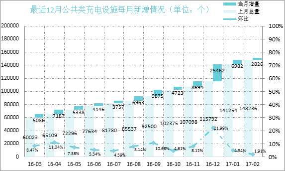 从2016年3月到2017年2月,月均新增公共类充电设施约7587个,2017年2月同比增长151.7%。