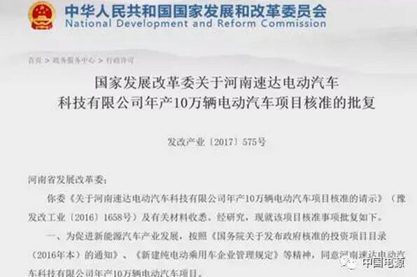 国家发展改革委关于河南速达电动汽车