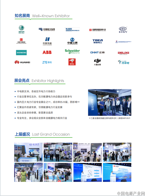 导语:为贯彻落实新发展理念和党中央国务院战略部署,展示能源电力行业创新发展成果,推动能源电力企业转型升级、高质量发展,助力企业开拓四川和西部市场,经国家商务部批准,成功举办了 20 届的四川国际电力产业博览会提档升级,将于 2024 年 5 月 23-25 日在成都世纪城新国际会展中心举行“2024 中国国际电力产业博览会暨绿色能源装备博览会”(CIPIE2024)。本次大会以“绿色发展·能动未来”为主题,集中展示发电、储能、输电、变电、配电、用电等产业链供应链各环节的新产品、新设备、新技术、新服务及解决方案,以“展览 + 会议”的形式为能源电力企业和相关单位搭建一个了解行业动态、洽谈贸易、开拓市场的交流合作平台。