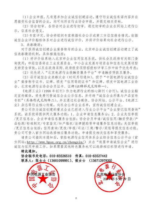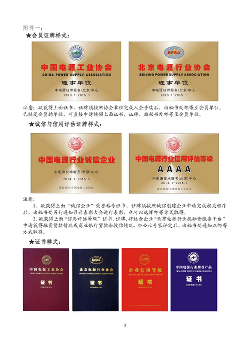 (3)召开诚信企业表彰大会(时间另行通知),授予“中国电源行业诚信企业”荣誉称号证书、证牌。颁发“信用等级证书”和证牌。颁发中国电源工业协会、北京电源行业协会会员证书、证牌(证牌样式见附件一)。