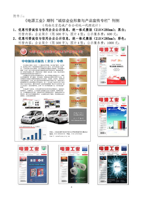 《电源工业》(1998年创刊)作为电源行业的核心期刊(会刊),诚信企业指定宣传媒体,将免费刊登诚信企业公示信息,并开辟“诚信企业形象与产品宣传专栏”(具体形式见附件二)。并且通过社会媒体、协会网站、公示平台、《电源工业》杂志等行业核心传媒,向社会公布企业名单,宣传诚信创建企业。