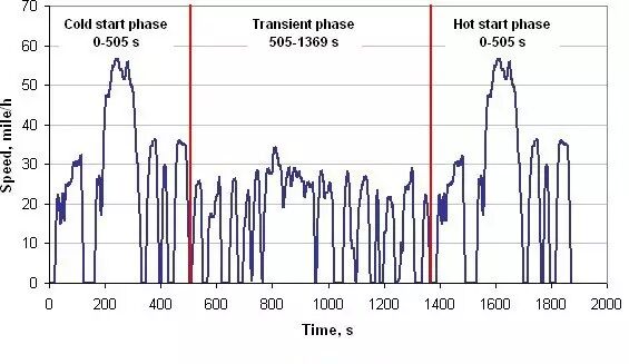 FTP城市行驶循环测试总行程为17.77公里,共计1877秒,包含505秒的冷启动(发动机周围平均温度20-30℃)、867秒的稳定状态和505秒的热启动三个阶段(其中,冷启动占有0.43比重因子,稳定状态占1个比重因子,热启动占0.57比重因子)。在这个过程中,平均时速34.12公里,最高时速91.25公里。